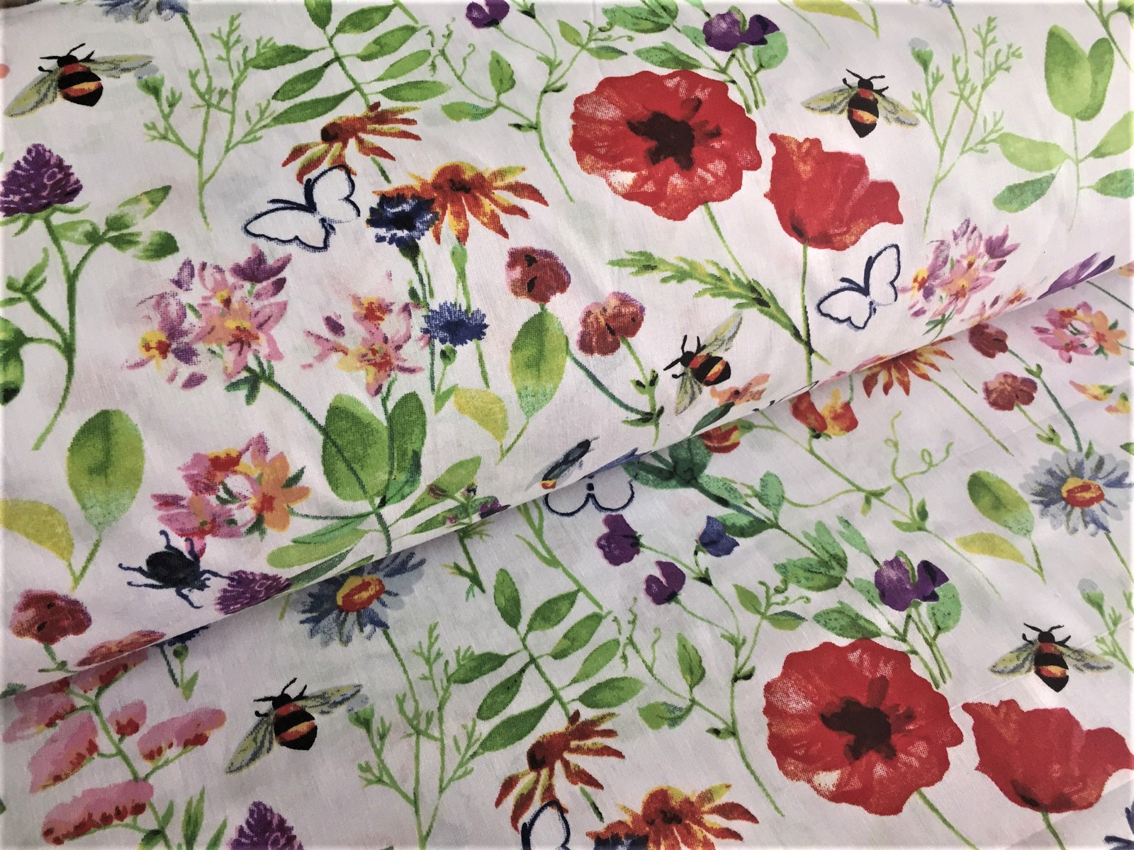 Bavlněná látka - plátno. Bílý podklad s potiskem rozkvetlé louky.