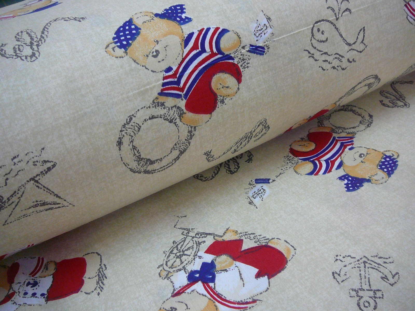 Bavlněná látka - plátno. Podklad je béžový a medvědi jsou v námořnických barvách.